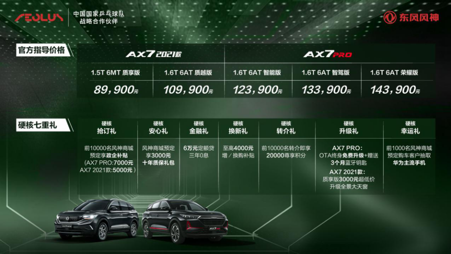 当硬核实力与智慧科技完美邂逅,将会擦出怎样的火花?栋梁本色,硬核升级,9月10日,著名军事评论家张召忠、中国乒乓球协会主席刘国梁、中国制造名片东风猛士强强集结,共同见证焕新而来的硬核智慧SUV——东风风神AX7 PRO的进阶之道。现场更有许昕、陈梦、孙颖莎等国乒名将助阵,各路高手各有风度,极限挑战跌宕起伏。作为东风风神面向主流SUV市场推出的重磅力作,东风风神AX7 PRO凭借硬朗造型、高效动力、智享科技、越级品质,上演一场精彩非凡的特别挑战行动,东风风神AX7 PRO正式上市,车系涵盖1.6T 6AT智能版、1.6T 6AT智驾版、1.6T 6AT荣耀版共计三款车型,官方指导价分别为12.39万元、13.39万元、14.39万元。此外,全民优选SUV ——AX7 2021款同步上市,官方指导价为1.5T 6MT质享版8.99万元、1.6T 6AT质越版10.99万元,让高品质出行的梦想轻松实现。