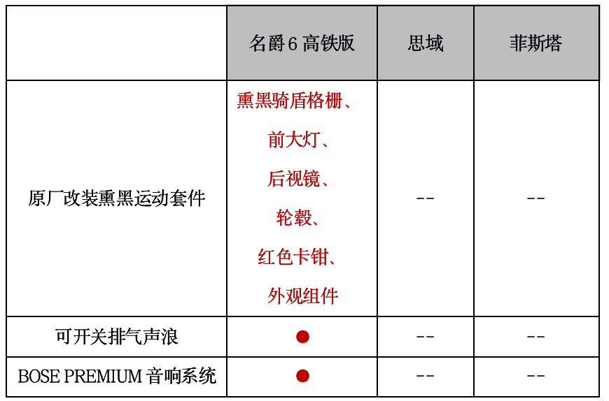 除了动力操控,在年轻消费者偏爱的改装方面,名爵6 高铁版也超越思域、菲斯塔成为三款车中“最强原厂改装”。它自带原厂改装熏黑套件,涵盖熏黑骑盾格栅、前大灯、后视镜、轮毂、红色卡钳及外观组件,全方位提升运动气场。此外,名爵6 高铁版还配备由知名排气控制供应商Faurecia提供的可开关运动排气声浪,和BOSE PREMIUM增强型运动风格音响系统,打造撼人心魄的听觉享受,不断升级年轻人渴望的速度和激情体验,定义“原厂改装”新高度,“同级最强改装”当之无愧!