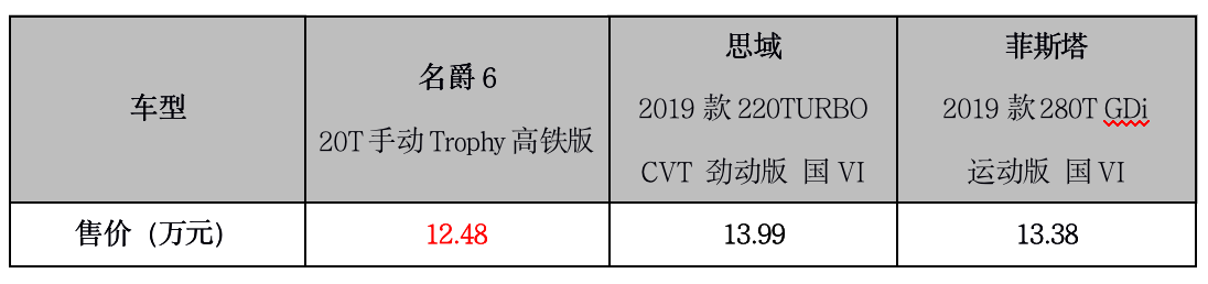 那么,在年轻人特别关注的运动轿车领域,名爵6 20T手动Trophy高铁版(以下简称名爵6高铁版)到底胜算几何?我们把它和目前市场上关注度较高的思域2019款 220TURBO CVT劲动版 国VI(厂商指导价13.99万,以下简称思域),菲斯塔2019款280T GDi运动版 国VI(厂商指导价13.38万,以下简称菲斯塔)进行对比,看看谁才是最具实力的运动轿车。