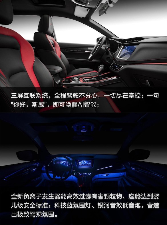 10寸中控大屏与7寸全液晶仪表、4.3寸触摸式空调液晶屏组成了三屏互通互联。一句"你好,斯威",就可语音播放音乐、导航、控制车辆,全程驾驶不分心。双系统手机互联、远程操控车辆、“组队接人”等功能,让每次出行更智趣。
