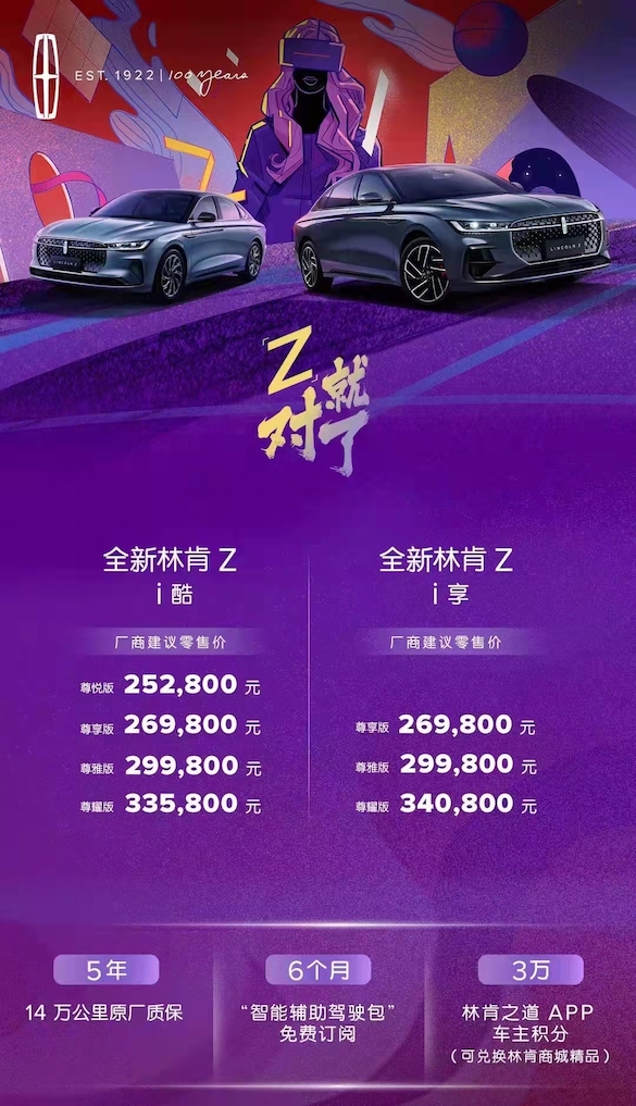 3月12日,汇聚品牌全球智慧、基于对中国年轻客户精准洞察所打造、林肯品牌开启全新百年后在中国市场推出的首款力作——“智领新生代座驾”全新林肯Z正式上市。新车共推出7款车型,售价区间为25.28-34.08万元。此外,购买林肯Z的用户还可享受5年或14万公里原厂质保和6个月“智能辅助驾驶包”免费订阅权益。
