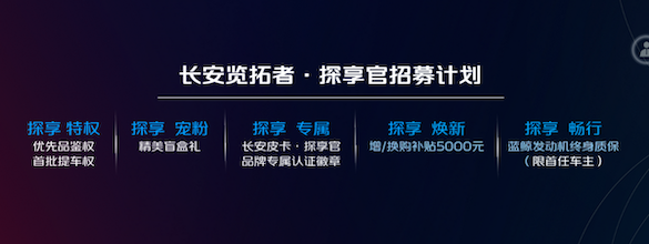 8月30日晚开始,“探享官招募计划”全网开启。前100名在皮卡新世代小程序上下订的长安览拓者蓝鲸动力版用户,订金9块9即可获得“五重探享”权益。具体为: