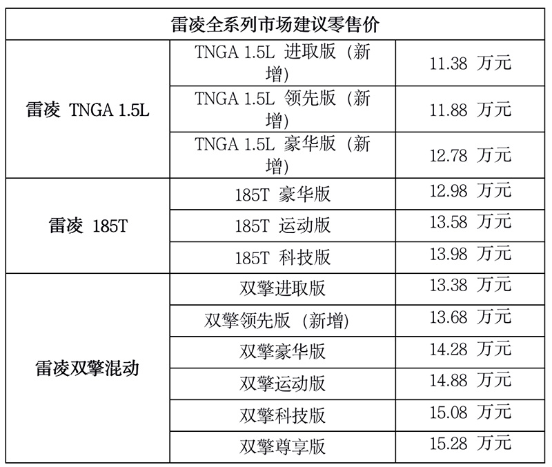 为响应消费者的多样化需求,2021款雷凌新增4大车型版本,包括TNGA 1.5L进取版、领先版、豪华版,以及双擎混动领先版。2021款雷凌再进化后共提供TNGA 1.5L、185T、1.8L HEV三大动力总成、一车双造型、全系共12款车型版本的丰富选择,全面满足消费者对中级轿车的多元化需求,市场建议零售价为11.38万元-15.28万元(全系),即日起全面发售。