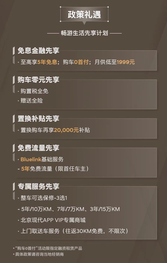 - 专属服务先享:整车保修3选1(5年/10万公里、7年/7万公里、3年/15万公里);北京现代APP VIP专属商城;上门取送车服务(往返30公里免费,不限次)。