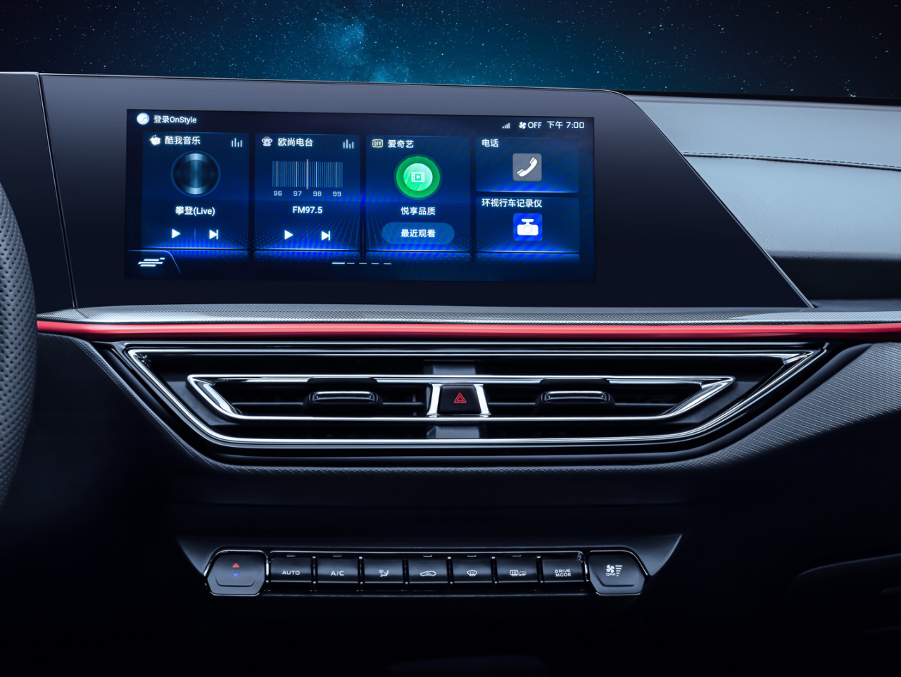 回形空调出风口,声微风柔,采用了三层镀铬设计,红色内饰点缀,与中控竞速光带相呼应,左右对称分布,这也是为了中和不规则设计带来的失衡,实现视觉上的平衡。