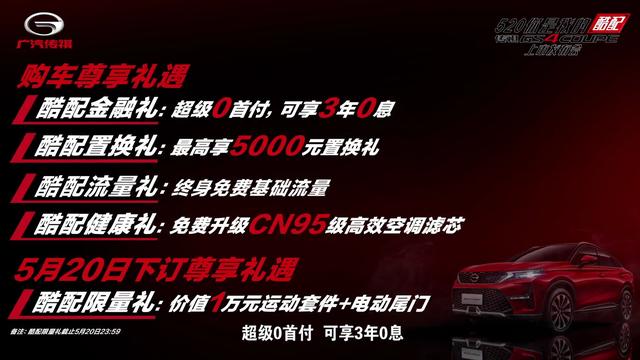5月20日,广汽传祺旗下轿跑SUV--传祺GS4 Coupe正式上市。新车共推出了2款车型,官方指导价13.68-14.68万元。传祺GS4 COUPE设计上更加时尚个性,主打年轻消费群体。官方还推出包括金融礼、置换礼、流量礼、健康礼在内的四重礼遇,同时520当日下订还有额外惊喜。