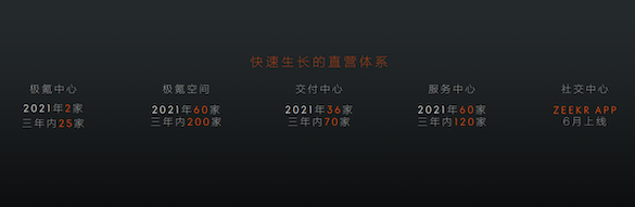 极氪直营:5大中心,为用户打造另一个“家”。极氪将快速建立直营体系,涵盖潮流的极氪中心、身边的极氪空间、专属的交付中心、专业的服务中心和在线的社交中心。按照规划,2021年,极氪将在全国范围内开设2家极氪中心、60家极氪空间、36家交付中心以及60家服务中心,社交中心ZEEKR APP也将上线。未来,这些数字也将快速扩充,实现全国网络覆盖。