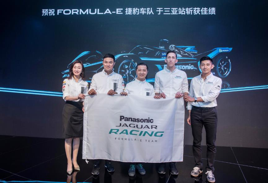 Formula E捷豹车队授旗仪式,自左向右:捷豹路虎中国企业传播及公共关系执行副总裁王燕女士,捷豹路虎中国与奇瑞捷豹路虎联合市场销售与服务机构市场及产品营销执行副总裁胡波先生,捷豹路虎全球董事、捷豹路虎中国总裁及捷豹路虎中国与奇瑞捷豹路虎联合市场销售与服务机构代理总裁潘庆先生,捷豹车队赛事总监James Barclay先生,Formula E捷豹车队车手董荷斌先生