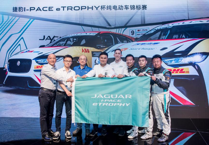 捷豹I-PACE eTROPHY杯中国车队手气仪式,自左向右:万邦新能源投资集团副总裁江建清先生,百度搜索市场部总经理熊赟先生,汽车之家总裁邵海峰先生,捷豹路虎中国与奇瑞捷豹路虎联合市场销售与服务机构市场及产品营销执行副总裁胡波先生,捷豹车队赛事总监James Barclay先生,捷豹I-PACE eTROPHY杯嘉宾车手程飞,中国青年车手张亚琦、王涛