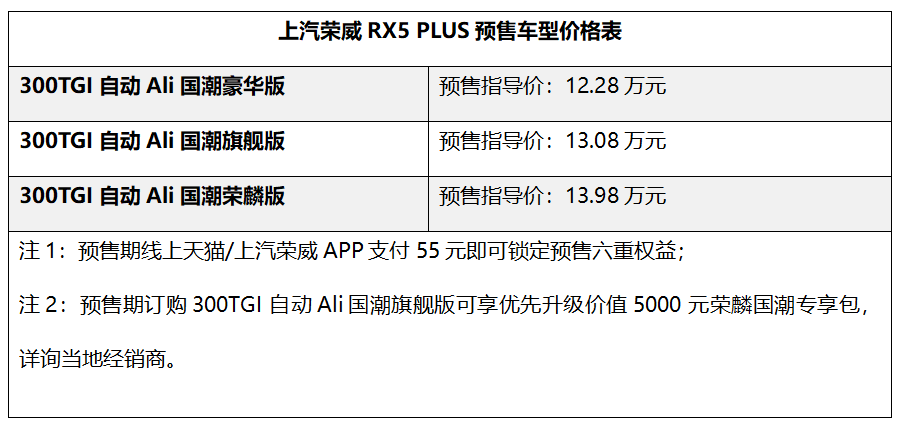 5月4日晚,备受关注的荣威RX5 PLUS正式开启预售。新车共发布了三款车型,预售价格12.28万元-13.98万元。即日起,参与预订的用户可享受30天无理由退车承诺、整车终身质保承诺、终身免费保养服务、官方售后VIP服务承诺、55元享上市5000元惊喜、优先升级国潮荣麟版专享包等六重权益。得益于超高品价比产品、超大力度优惠、超贴心服务,荣威RX5 PLUS开启预售1小时(24:18),仅上汽荣威天猫旗舰店就收到了1231辆订单,展现出新国潮智联网SUV的强大号召力,成为用户在“上海五五购物节”期间最喜爱的科技单品。