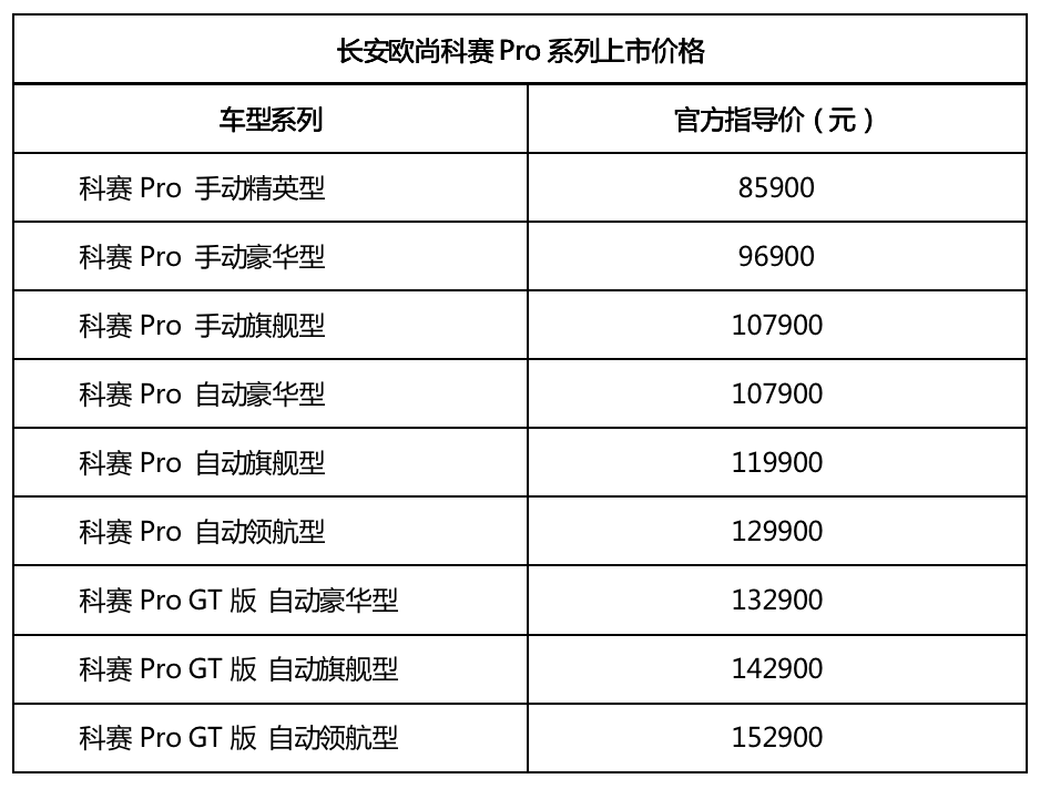 2020年9月28日,长安欧尚汽车旗下全新中大型旗舰SUV——长安欧尚科赛Pro正式发布上市。新车定位为“中国大家庭出行大7座SUV”,共推出科赛Pro与科赛Pro GT版2个序列9款车型,售价区间8.59-15.29万元。