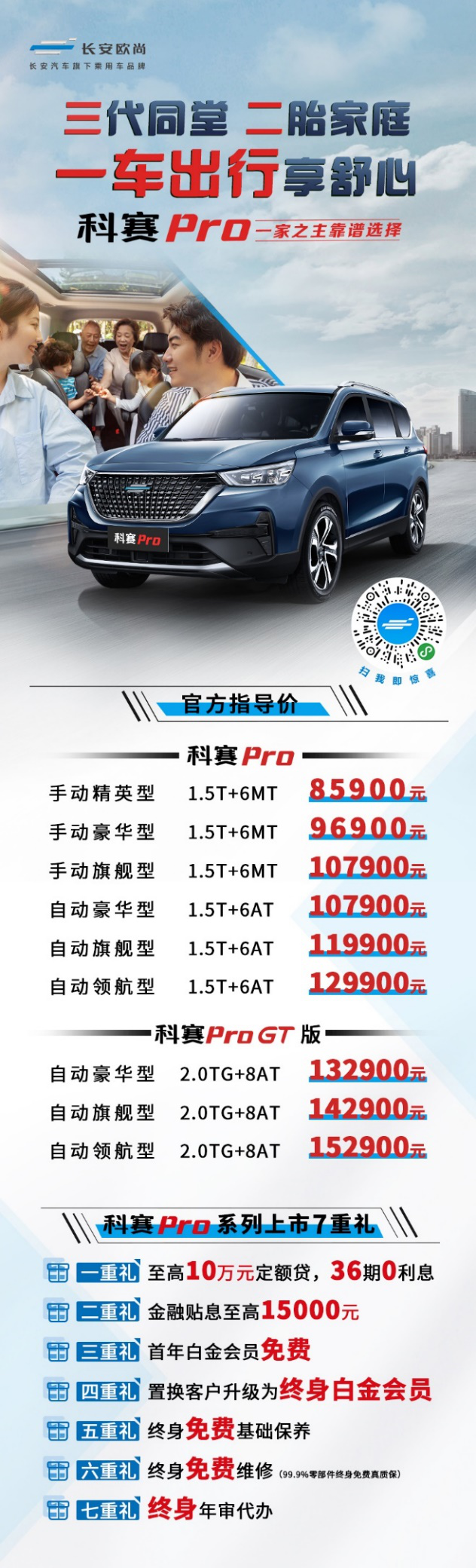 优享超值,购车无忧。科赛Pro系列不仅带来了更适合大家庭出行的SUV新选择,还打破高品质家用7座SUV的价格壁垒,提供了人人都能够得着的亲民价格,以最低8.59万的超实惠价格,以及至高10万元定额贷36期0利息、金融贴息至高15000元、首年白金会员免费、置换客户升级为终身白金会员、终身免费基础保养、终身免费维修(99.9%零部件终身免费真质保)、终身年审代办等7重购车礼遇,让每一个想要改善家人出行体验的顾家一族都能轻松拥有心仪的大7座SUV座驾,守护每一个“三代同堂”“二胎家庭”的“一车出行”幸福生活。