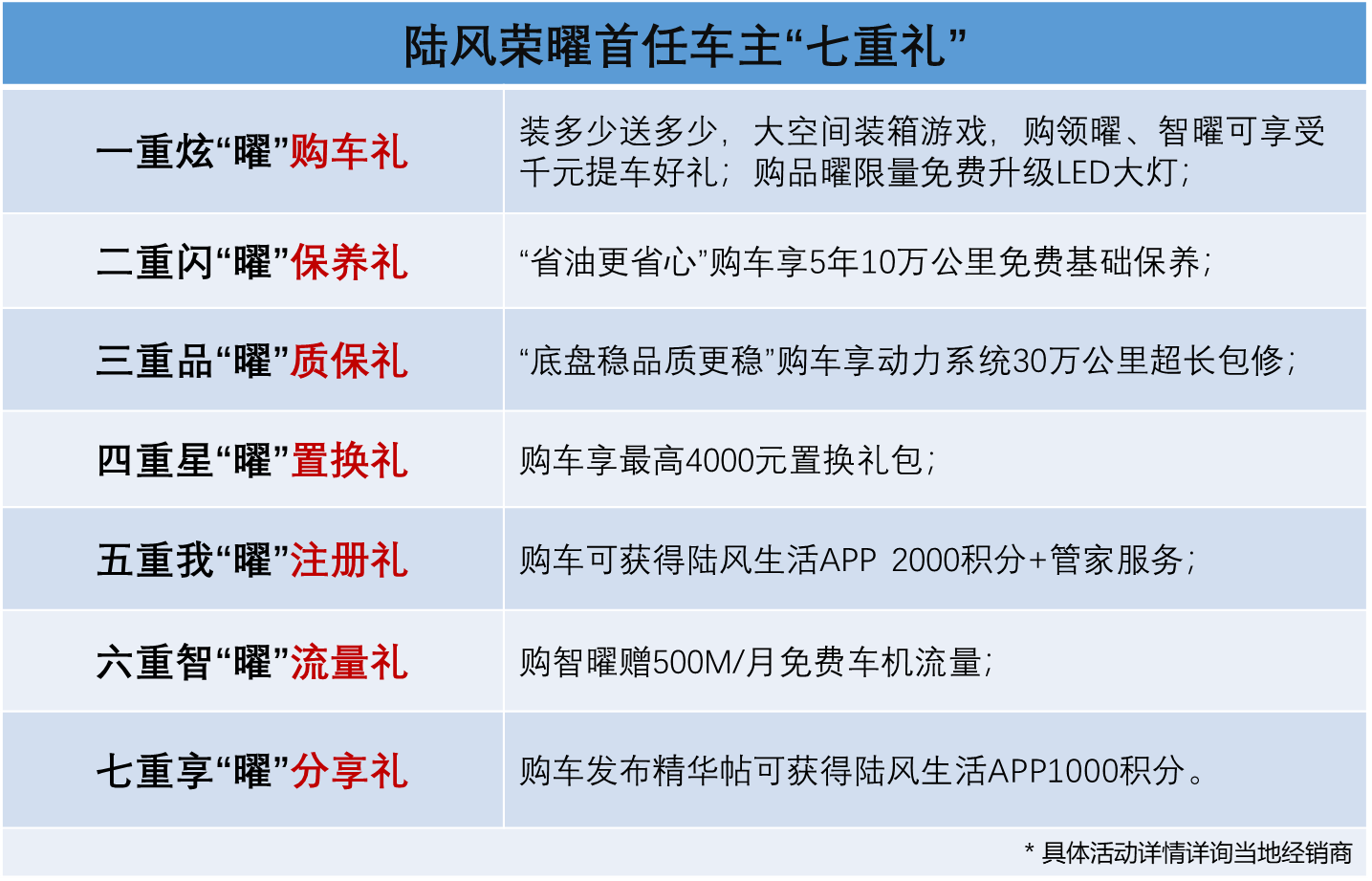 更值得一提的是,陆风荣曜还推出了首任车主“七重礼”:购车礼、保养礼、质保礼、置换礼、注册礼、流量礼、分享礼。其中既包括千元提车好礼,也包括更长年限免费基础保养、动力系统超长包修等养护政策。可以说,从买车到用车,为广大用户提供了丰富全面的购车保障。