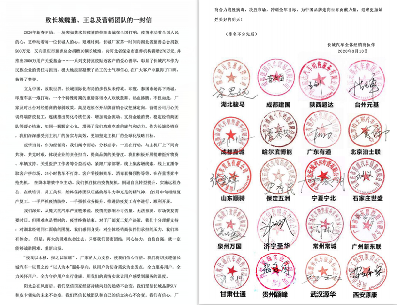 3月10日,长城汽车收到124家经销商伙伴联名书写的《致长城魏董、王总及营销团队的一封信》,信中经销商伙伴对长城汽车在疫情期间的大力支持表示感谢,这封至真至诚的感谢信,提振了长城汽车集体信心的同时,也给处在“寒冬”的车市带来温暖。