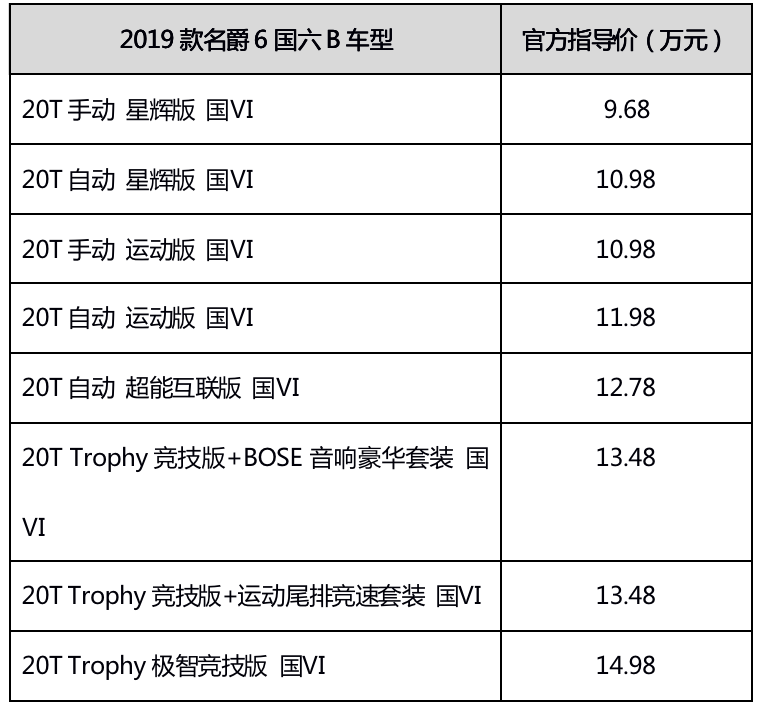 2019款名爵6国六B车型上市 售9.68万元-14.98万元