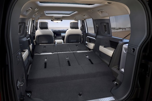 路虎卫士130车型沿袭了卫士家族一贯的实用多功能性,用更大气磅礴的姿态开启传奇之旅。新车的长宽高尺寸分别为5,358mm(含备胎)*2,105mm(后视镜展开后)*1,970mm,轴距为3,022mm,在后部将车身轮廓延长了340mm,带来八座(2+3+3)的超大空间。其中,专门设计的第3排座椅座垫宽度达1,200mm,有效腿部空间达804mm,带来宽敞舒适的乘坐感受。后排还支持40:20:40可折叠分离,在座椅直立情况下,后备箱容积达到389升;在座椅折叠情况下,后备箱容积可达1,232升,为越野出行提供足够的储物空间。路虎卫士130车型还提供了五座车型选装,带来同级难以企及的超大后备箱空间。