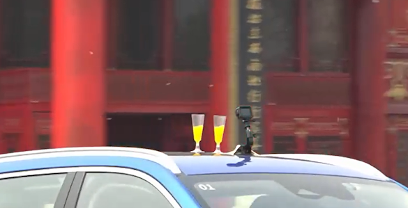 进入 “顺”的测试环节,主要检验柠檬混动DHT的平顺性。在试驾车的天窗放置两个杯子,并加注一定量的果汁。试驾车在场地进行起步、加速、减速等一系列操作,会涉及到油电切换以及能量回收,观察水杯是否会倒以及果汁的晃动情况。