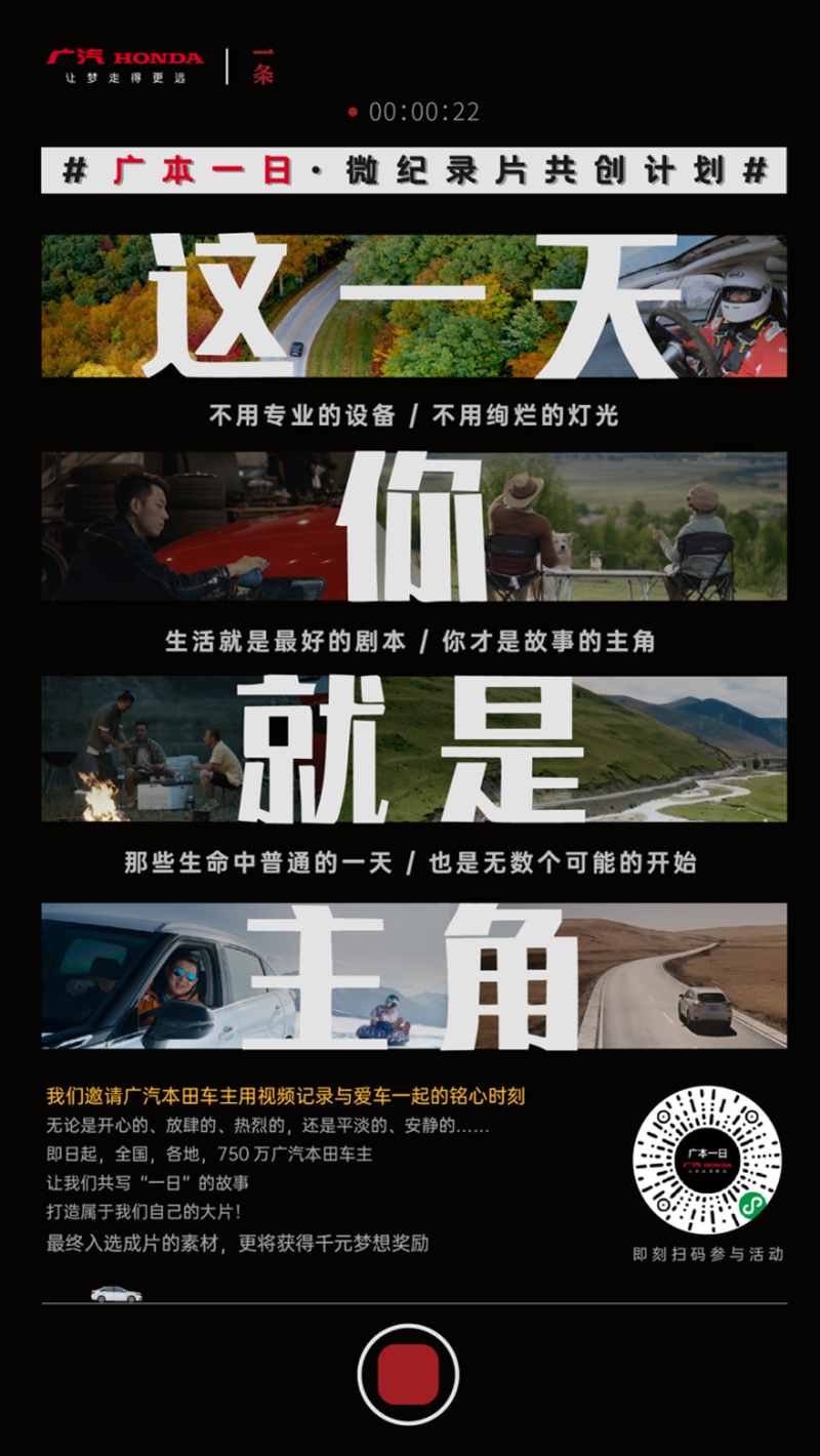 今年7月,广汽本田面向全国车主启动了“广本一日”微纪录片共创计划,以企业“搭台”、用户“唱主角”的形式,征集车主和粉丝共创“一日”的故事。活动以“这一天,你就是主角”为主题,每一位广汽本田车主都可以成为故事的主角。车主们不需用专业的设备,也不需用绚烂的灯光,只要拿起手机记录自己与爱车在一起的时刻,即可参与打造这个“广本粉”专属的“大片”。