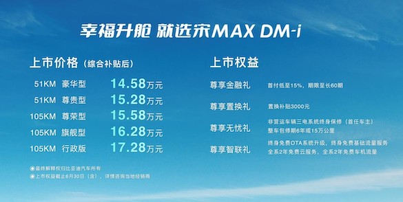 3月12日,2022款宋MAX DM-i正式上市,共推出五个版本车型,综合补贴后售价14.58万元—17.28万元。宋MAX DM-i直击用户痛点,以4.4升百公里亏电油耗,1090公里超长续航,7.9秒零百加速等实力,彻底颠覆了传统燃油MPV价值认知,为中国家庭带来了6/7座用车的最优选。