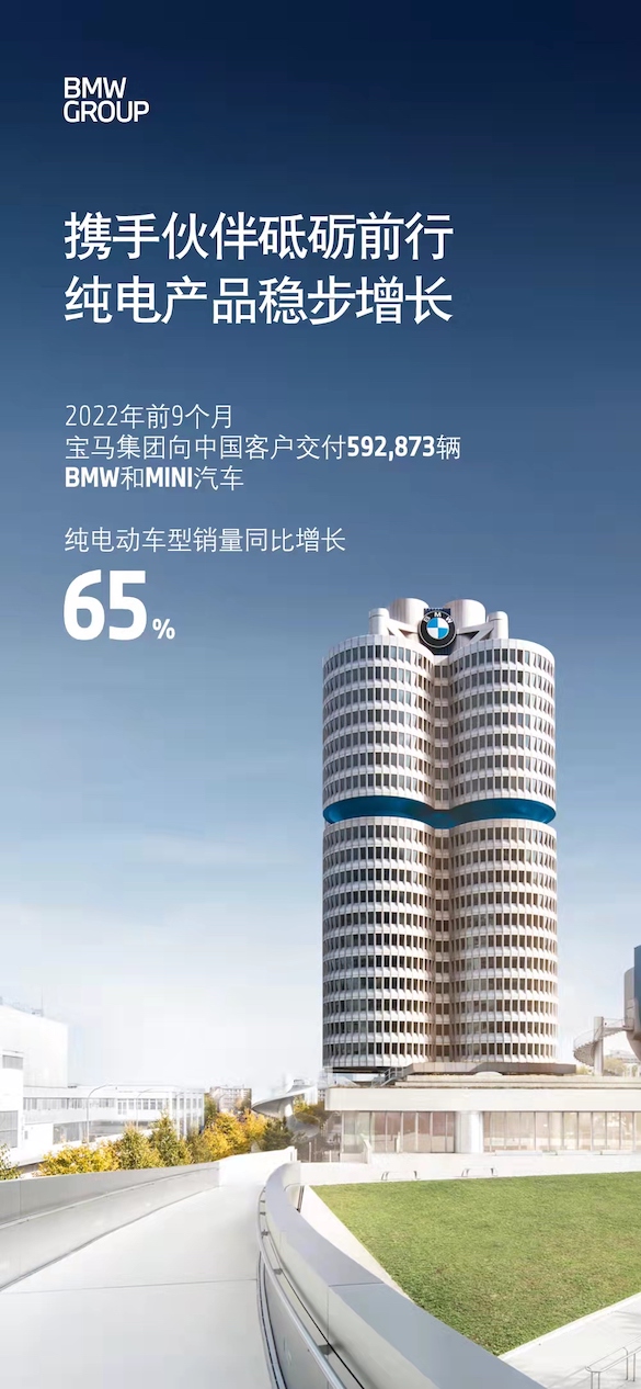 宝马集团积极应对汽车市场的严峻挑战,今年前9个月,共向中国客户交付592,873辆BMW和MINI汽车。其中,纯电动车型销量保持强劲势头,前三季度同比增长65%。