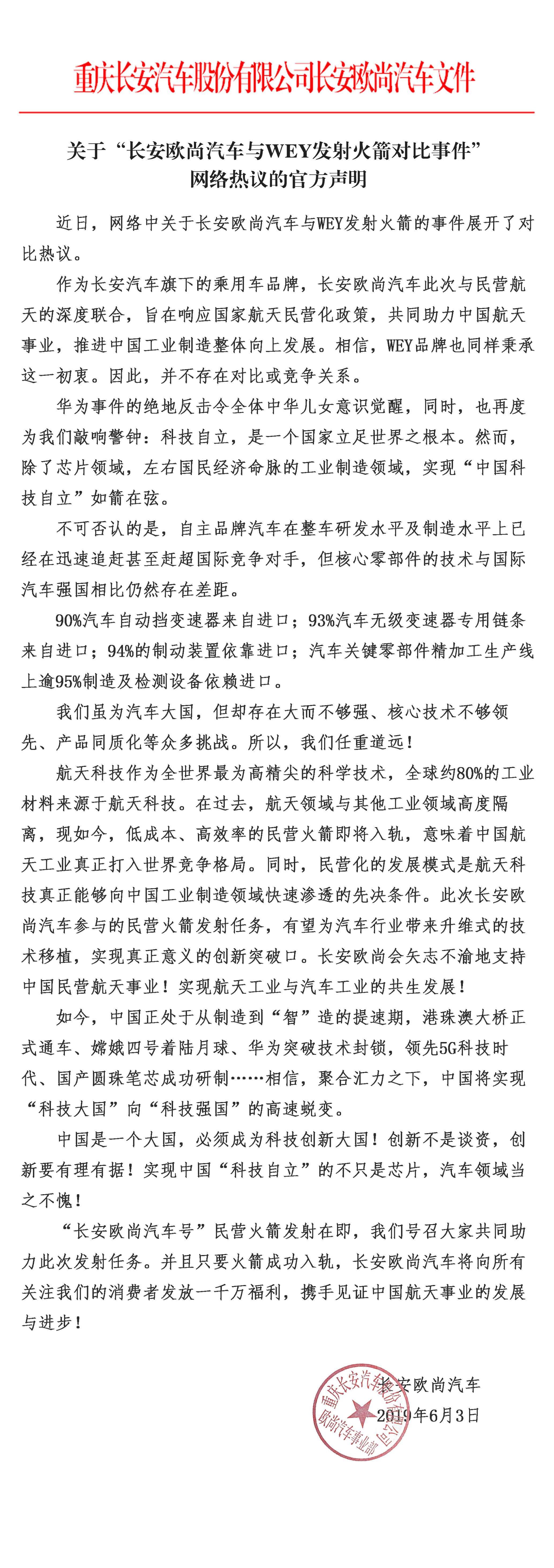 近日,关于网络中网友调侃热议话题【中国两车企发火箭千万对赌】,长安欧尚汽车对此发出官方声明:此次与民营航天深度联合,旨在响应国家航天民营化政策,真正推进中国工业制造整体向上发展,加速汽车行业实现“科技创新、自立”。与WEY不存在对比或竞争关系。并依据网友讨论意见发放千万福利。具体声明如下: