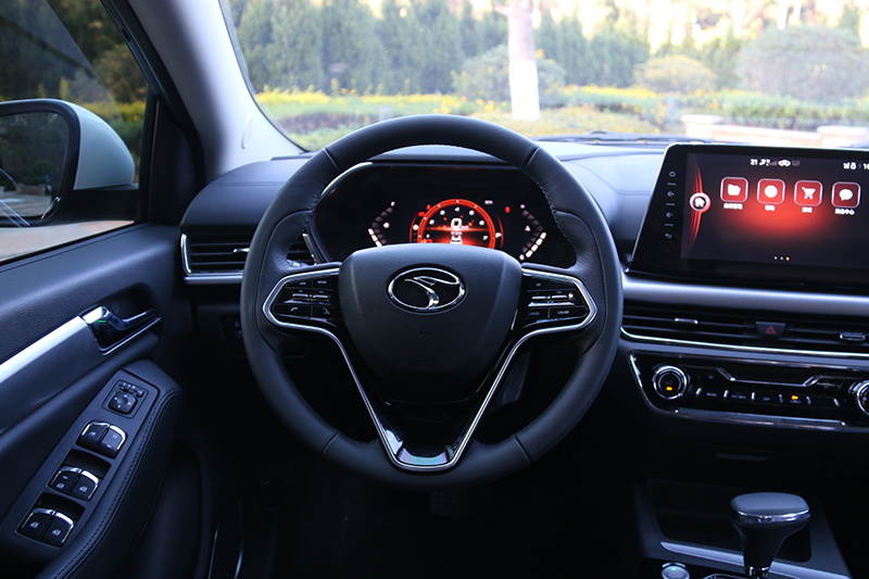 三辐式多功能真皮方向盘大小适中,上面集成多媒体、语音控制、定速巡航控制等按键,操作便捷。顶配车型搭载7英寸的彩色液晶仪表盘,显示信息十分丰富。
