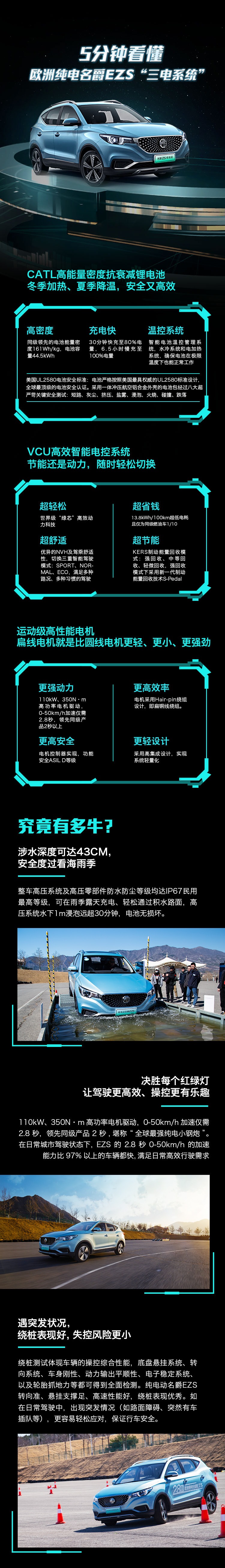 电池方面,纯电动名爵EZS采用了目前全球及合资新能源车所使用的NCM 523三元锂电池,能量密度达到同级第一的161Wh/kg。另外,整车还成功挑战43cm的涉水深度,同时正是得益于车辆达到美国严苛的UL2580标准、IP67的防尘防水民用最高等级,使车辆可在雨季露天充电,也无惧暴雨积水路面。