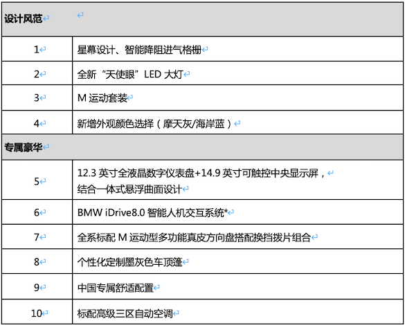 新BMW 3系针对中国客户需求进行专属升级,提供同级领先的超长轴距、中国独有的舒适座椅等,令后排空间宽大舒适,乘坐舒适性全面提升。丰富的专属配置也充分展现了宝马集团践行“家在中国”战略,秉承“中国优先”原则,对中国市场和用户的深入洞察,提供多达10项高价值亮点配置。