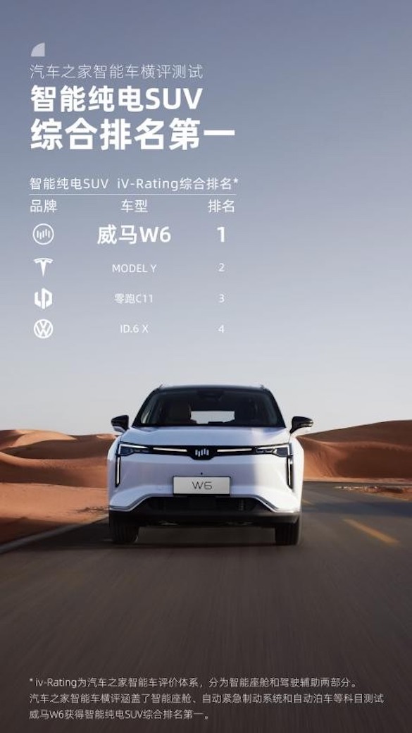 传统燃油车时代,大家习惯以轴距、排量、内饰配置等对汽车进行分级,以舒适性、驾驶性、安全性等对车辆进行评价。随着智能电动汽车的诞生和发展,用户需求和评价体系也随之变化。近期,汽车之家《超级测试》栏目完成了多款主流智能车横评测试,测试涵盖智能座舱、AEB功能和自动泊车等版块。最终,威马W6在智能座舱及智能驾驶两大领域展现出强劲竞争力,在汽车之家iV-Rating(汽车之家智能车评分体系,分为智能座舱和智能驾驶两部分)评价体系中,获得智能纯电SUV综合排名第一的优异成绩。