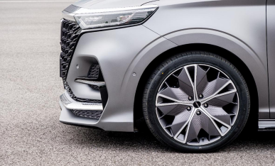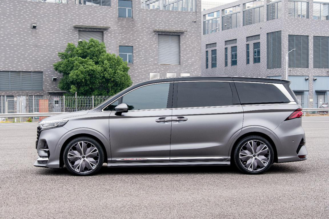 来到车身侧面,荣威iM8采用了跨界造型,整体设计风格向SUV贴近,摆脱传统MPV笨重感。腰线采用夸张的折面设计,凸显力量感与运动感;A柱、D柱、车顶融为一体,配合黑色处理的B柱C柱,营造了悬浮车顶的视觉效果,让整车姿态灵动飘逸。细节方面,荣威iM8搭载四幅轮毂,并采用折面设计,配合亚光漆面处理,带来专属未来的科技感。