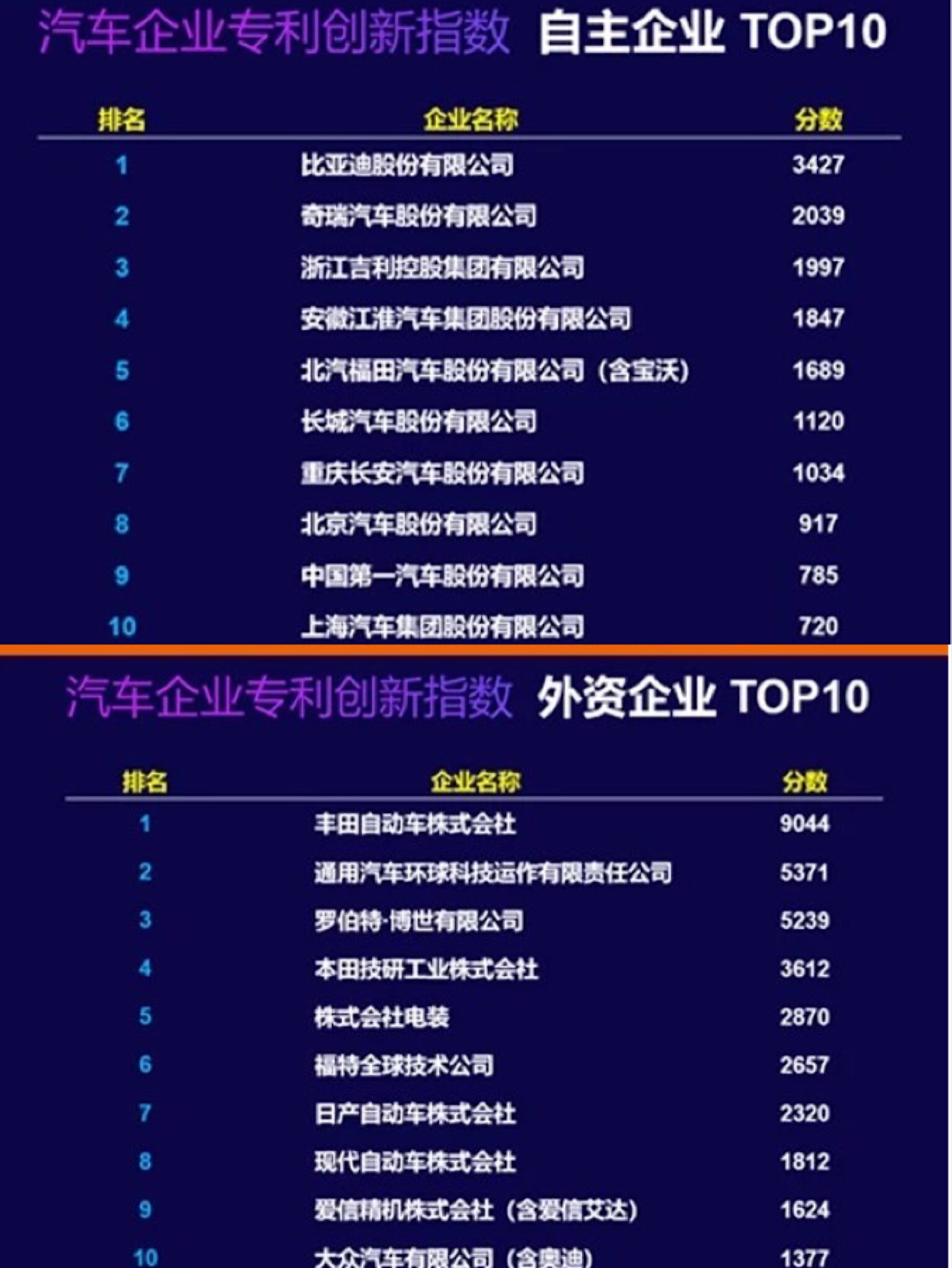 根据中国汽车技术研究中心有限公司2018年10月发布的《汽车企业专利创新指数》,国内车企TOP10得分远远低于外资车企,排名第一位的比亚迪分数为3427,而外资车企第一名丰田自动车株式会社的分数高达9044。本田以3612居于外资车企第四,长城汽车则以1120居于自主企业第六。