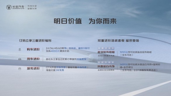 同时,长安汽车还为用户准备了明日价值大礼包,助力用户轻松开启美好明日生活。在第二代CS75PLUS上市之际,用户订购立享三重进阶福利:购车进阶福利,最长60期零、低利息,最低0首付及至高4000元置换补贴;用车进阶福利,首任车主享发动机核心零部件终身质保;服务进阶福利,OTA升级终身免费、基础流量终身免费、增值流量3年免费。同时,考虑到不同用户的需求,长安汽车还为用户准备了格栅选装包、品质升级包等双重进阶选装套餐。