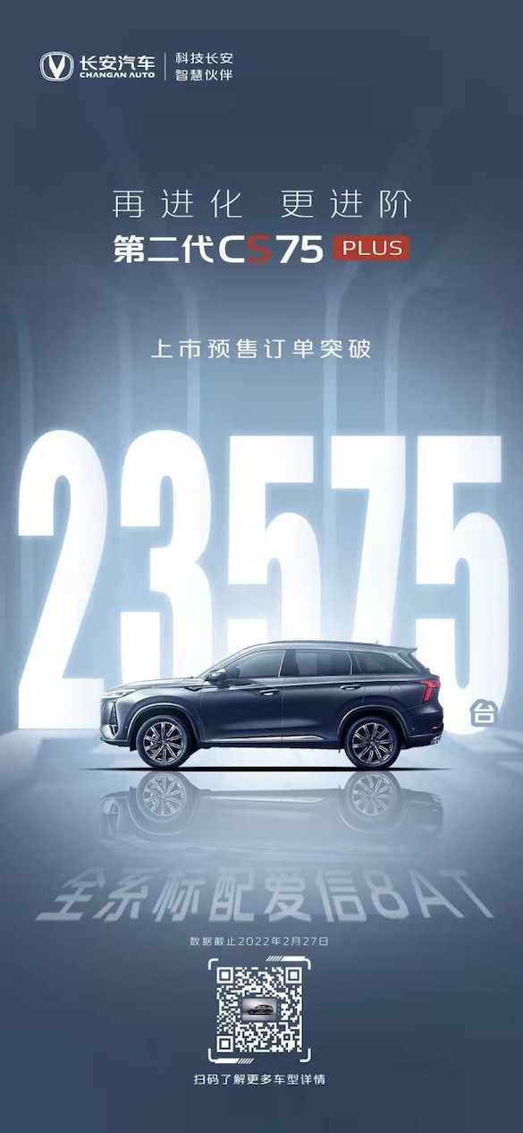 长安CS75系列自2014年上市以来,以超过150万辆的销量表现,成为市场上最受欢迎的SUV产品之一。第二代CS75PLUS自1月18日开启预售以来,目前已收获23575辆订单,在短短时日内再次证明了用户对长安汽车、对CS75系列的认可与支持。