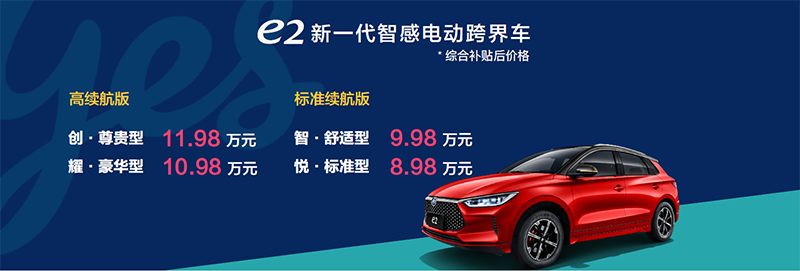e2是对品牌“加乘”哲学的全新演绎,正如比亚迪汽车销售有限公司总经理赵长江所言:“瞄准年轻化,在充满可能性的年代,e2给年轻用户最好的理由,做最简单的选择。为了推动电动汽车普及,我们用极致产品力加极致定价造就未来趋势!我们相信e2会成为10万级最强纯电产品,我们也号召更多的年轻人和年轻家庭,一起迈入智能电动出行新生活!”