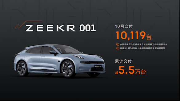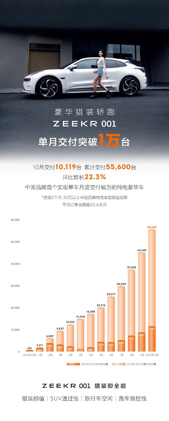 在发布会上,极氪智能科技CEO安聪慧首先晒出了极氪001的最新 “成绩单”:10月份交付量破万,达到了10,119台,环比增长22.3%,成为中国品牌首个实现单车月交付破万的纯电豪华车。极氪001交付持续加速,累计交付量超5.5万台,平均大定订单金额超过33.6万元,连续3个月获得30万元以上中国品牌纯电车型销量冠军。从11月1日起,极氪001新下定用户在下定后的72小时内可随时锁单(超过72小时自动锁单),预计下定后6-8周内交付,进一步缩短了用户的等待时间。