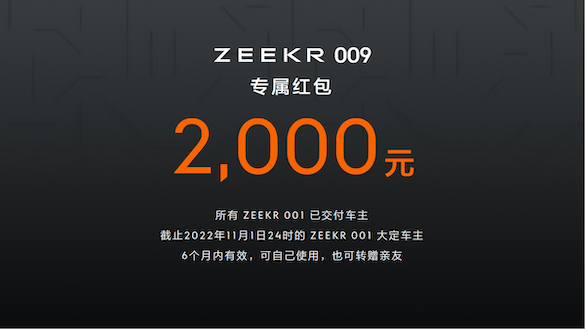 同时,极氪为001车主准备了价值超过2亿元人民币的专属红包:所有极氪001已交付车主,以及截止2022年11月1日24:00点前的001大定车主,都将获得价值2000元人民币的极氪009专属红包(可自用/转赠送亲友,6个月内有效)。