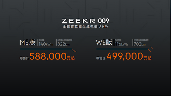 - ZEEKR 009 ME版 140kWh 58.8万元;
