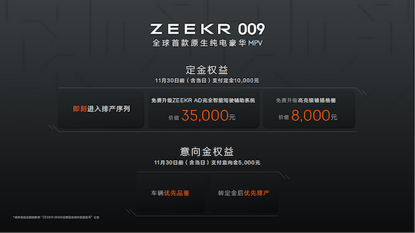 定金权益:11月30日前(含当日)支付定金10,000元,即刻进入排产序列。免费升级价值35,000元ZEEKR AD完全智能驾驶辅助系统,免费升级价值8,000元高亮银镀铬格栅。