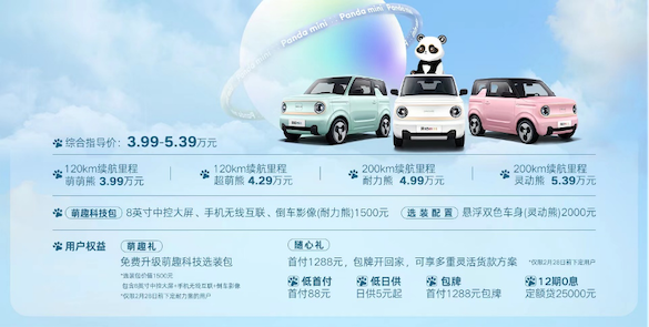 吉利熊猫mini在广州车展亮相后,呆萌的设计以及它微型新能源车的身份就吸引了众多消费者的青睐。2月6日,吉利熊猫mini以一场沉浸式直播释放超萌力,宣告正式出道。熊猫mini提供200km和120km两种续航版本共4款车型,售价区间为3.99万元-5.39万元。同时,吉利汽车为熊猫mini准“饲养员”送出双重认养礼:萌趣礼——2月28日前下定耐力熊的用户可免费升级价值1500元的萌趣科技选装包,包含8英寸中控大屏+手机无线互联+倒车影像;随心礼——2月28日前下定用户可享低首付88元、低日供5元起、首付1288元包牌以及12期0息定额贷25000元等灵活贷款方案。