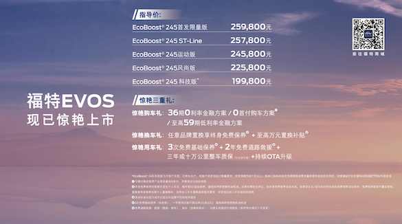 - 福特EVOS EcoBoost® 245风尚版实现20万以上起步即高能,6秒俱乐部加持、巨屏座舱、车路协同系统等同级首创或领先的科技化配置一应俱全。