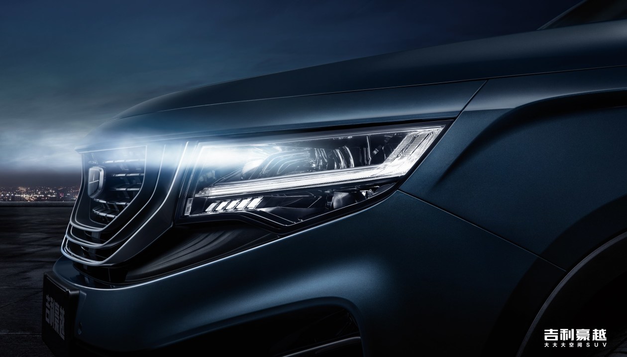 豪越沿承吉利家族化语言并进行演变,中网由内向外纵深渐变,如同宇宙回响,链接星耀矩阵大灯组。新车采用了同级独有ADB矩阵式LED大灯,可根据车身高度、行车速度、方向盘转动角度以及道路灯光和车辆情况等,自动在水平与垂直方向上调整光轴。