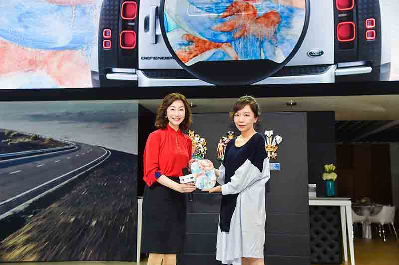 捷豹路虎中国公共关系与企业传播执行副总裁、联合市场销售与服务机构市场营销代理执行副总裁王燕女士(左),“融合之士”设计者艺术家梁远苇(右)
