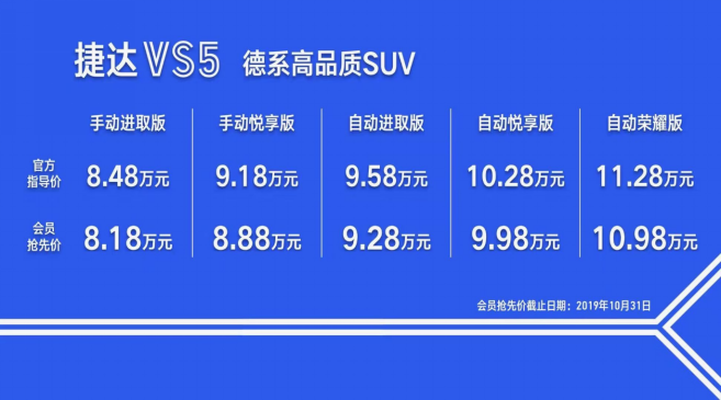 这款拥有德系血统,传承大众品质的新车共推出五款车型,官方指导价84,800-112,800元。这也让捷达VS5成为首款指导价在十万以内的德系合资SUV。捷达VS5为满足年轻用户需求而来,超高的性价比和德系的高品质让更多年轻消费者买得起、用得好,轻松享受德系高品质SUV带来的多彩生活。