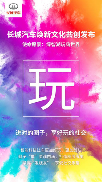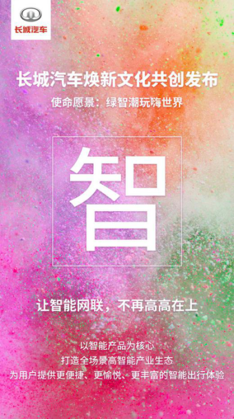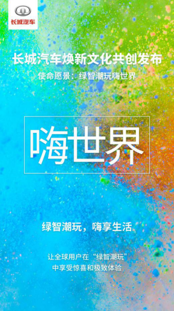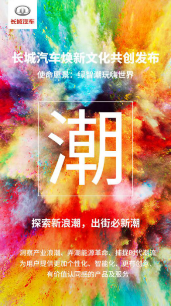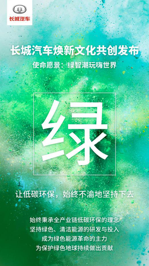 为此,长城汽车提出全新使命愿景“绿智潮玩嗨世界”,其中“绿”表示将秉承全产业链低碳环保的理念,坚持绿色、清洁能源的研发与投入,为保护绿色地球持续做贡献;“智”表示将与科技创新时代同频共振,以智能产品为核心,打造全场景高智能产业生态,为用户提供更便捷、更愉悦、更丰富的智能出行体验;“潮”表示将洞察产业浪潮、弄潮能源革命、捕捉时代潮流,提供更个性化、智能化、更有创意、有价值认同感的产品及服务;“玩”表示在智能科技的加持下让车更好玩,同时赋予产品文化内涵,汇聚具有共同爱好的用户群体玩在一起,共创专属的社交生活;“嗨世界”表示致力于全球化发展,让全球用户在“绿智潮玩”中享受惊喜和极致体验。