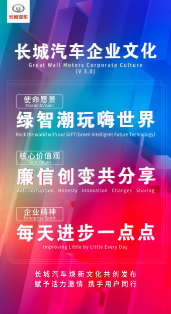 未来,在“绿智潮玩嗨世界、廉信创变共分享、每天进步一点点”这21个字的全新企业文化赋能下,长城汽车将继续聚焦“以用户为中心”的发展方向,全力践行走向世界的全球化战略,在更多领域展开大刀阔斧的改革、细致入微的调整,持续推进长城汽车由“中国汽车制造企业向全球化科技出行公司”转型的步伐。