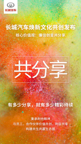 在新的核心价值观“廉信创变共分享”中,“廉”和“信”是长城汽车成立以来始终奉行的行为准则,未来,长城汽车将继续秉持公平公正、廉洁自律的作风,始终以用户为中心,诚实守信、合规经营;“创”和“变”是长城汽车向上发展的内在驱动力,长城汽车将继续坚持精准投入、追求行业领先,培厚创新土壤,不断驱动着企业以向死而生,坚如磐石的信念砥砺前行;“共分享”是长城汽车首次纳入核心价值观的内容,这种开放包容的价值观引领下,长城汽车将构建“森林模式”共生共赢生态圈,孵化更多元的业务,与员工和全产业链一同创造未来,分享成果。
