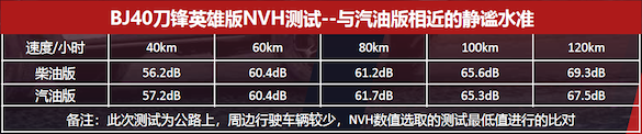 根据媒体在道路中的实测,刀锋英雄柴油版60km/h噪声60.4dB,时速80公里噪声61.2dB,时速100公里噪声65.6dB,时速120公里噪声69.3dB,整体的控噪水平与汽油版车型几乎一致。那么BJ40刀锋英雄柴油版是如何做到的?