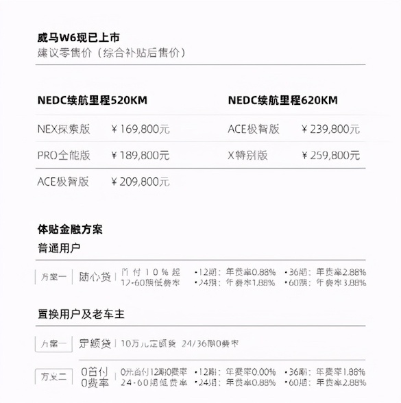 作为造车新势力上半年唯一交付的全新车型,威马W6是国内首款无人驾驶量产的智能电动汽车。新上市的威马W6共5款车型,售价区间为16.98-25.98万元。全车尺寸为4620/1847/1730mm,轴距达到2715mm,搭载160kW永磁同步电机,NEDC续航里程最高可达620km。