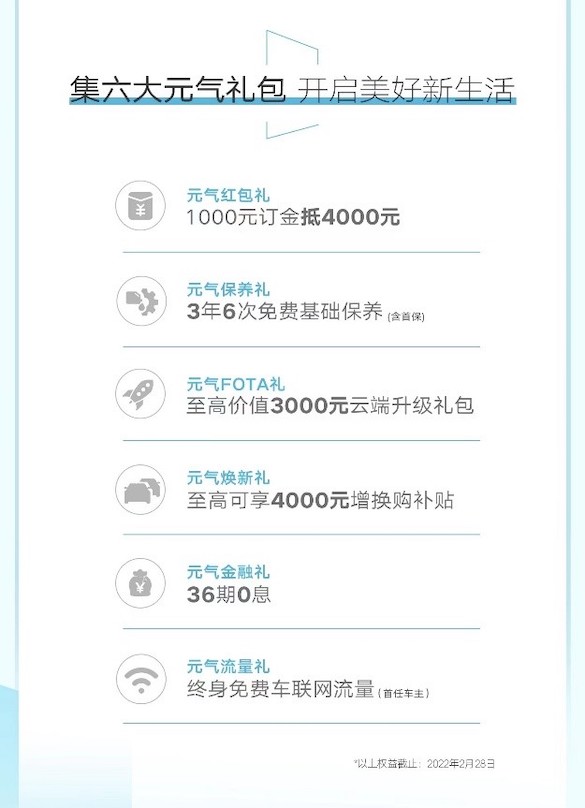 同时,帝豪L还为在2022年2月28日前购车的用户推出丰厚“元气礼包”:1、元气红包礼,1000元订金可抵4000元购车款;2、元气保养礼,3年6次免费基础保养(含首保);3、元气FOTA礼,上市即快速推送首次升级,包含全系升级华为HiCar、手机智能蓝牙钥匙、火山车娱(抖音、西瓜视频、懂车帝),至尊型升级科技飞天霓裳灯舞在内的至高价值3000元FOTA云端升级礼包;4、元气金融礼,36期0息;5、元气焕新礼,增换购补贴至高4000元/辆;6、元气流量礼,首任车主终身免费车联网流量。