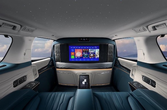 世纪CENTURY四座私享版搭载的豪华智慧幕墙系统配备32吋可升降智能屏,智能屏升起时,后排乘客可通过前车实况前置摄像头查看前舱情况和前方路况;需要时可通过Cabin talk前后舱对讲系统进行双向通话。智能屏支持Wi-Fi、USB、蓝牙连接以及iOS、安卓系统等多模式智能投屏;用户还可以在屏幕应用商店内下载APP应用,包括视频、音乐、游戏等,享受愉悦、智能出行。此外,后排座椅中央扶手区还集成8吋智控屏,单独由一颗高通骁龙8155芯片提供算力,掌控包括座椅、门窗、空调、音响、星空顶、智慧幕墙等功能控制,并拥有极其流畅、细腻生动的操作体验。